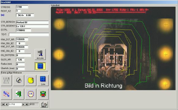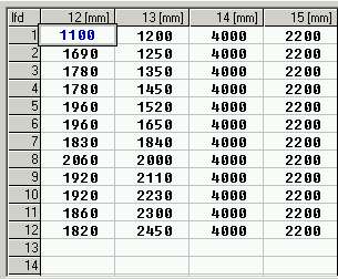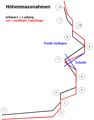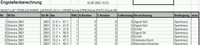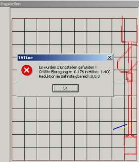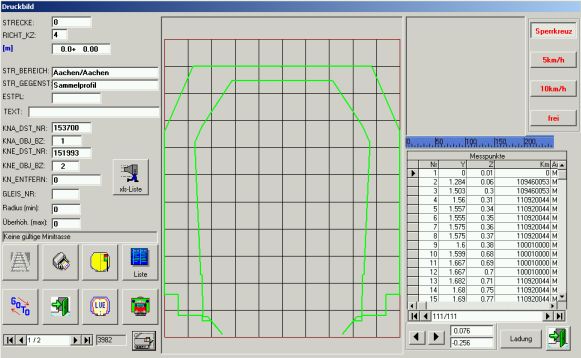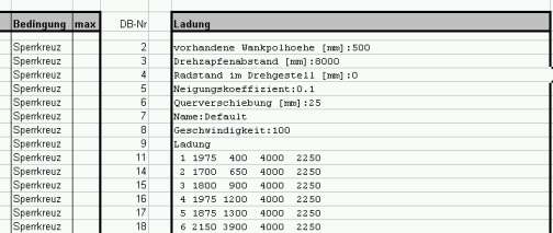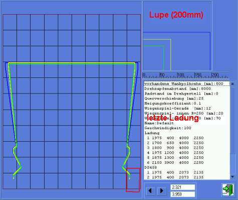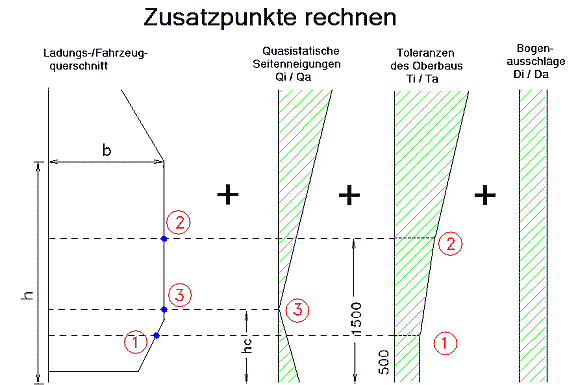 Erläuterung zum Ergebnis der Engstellenberechnung: 12 = Ladungsbreite 13 = Ladungshöhe 14 = Länge des Überhanges 15 = innerer Querschnittabstand 18- = Raumbedarf in der Gerade 18(r)= Raumbedarf bei r=250 ___ = Ladungshöhe mit vertikalen Zuschlägen Q_ = Quasistatische Seitenneigung in der Geraden T_ = Toleranzen des Oberbaus in der Geraden D_ = Bogenausschläge in der Geraden Q(r) = Quasistatische Seitenneigung im Bogen r=250 T(r) = Toleranzen des Oberbaus im Bogen r=250 D(r) = Bogenausschläge im Bogen r=250